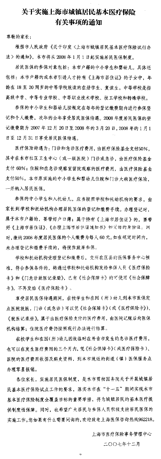 关于实施上海市城镇居民基本医疗保险有关事项的通知