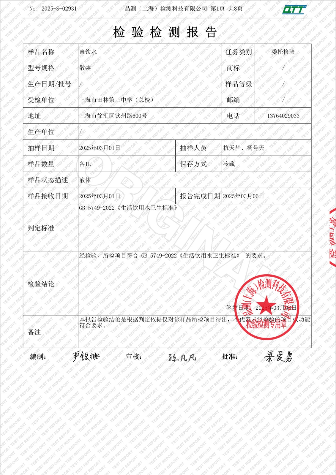 2025学年田林三中直饮水检测报告3月检