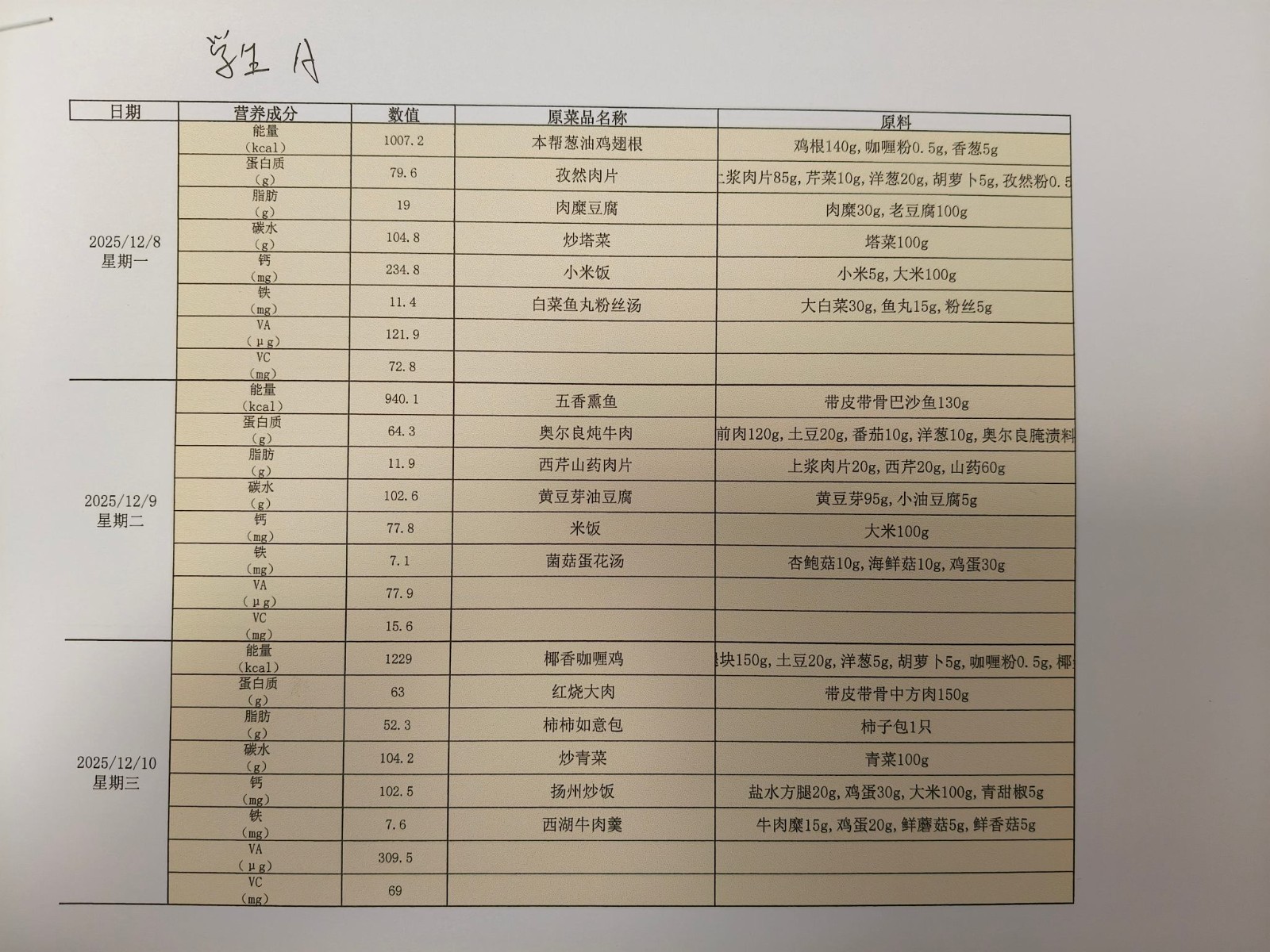 2025学年第一学期第七周菜单