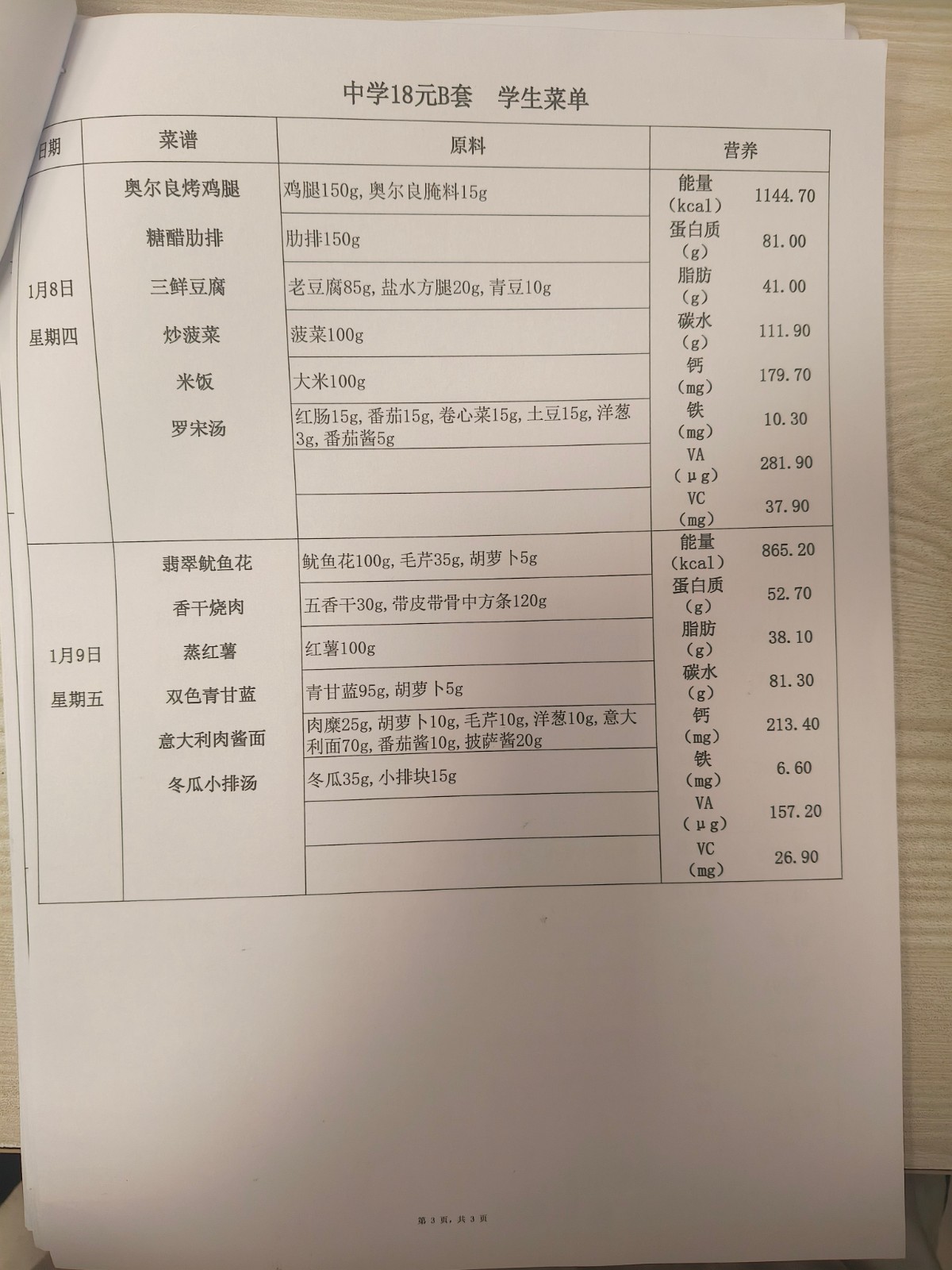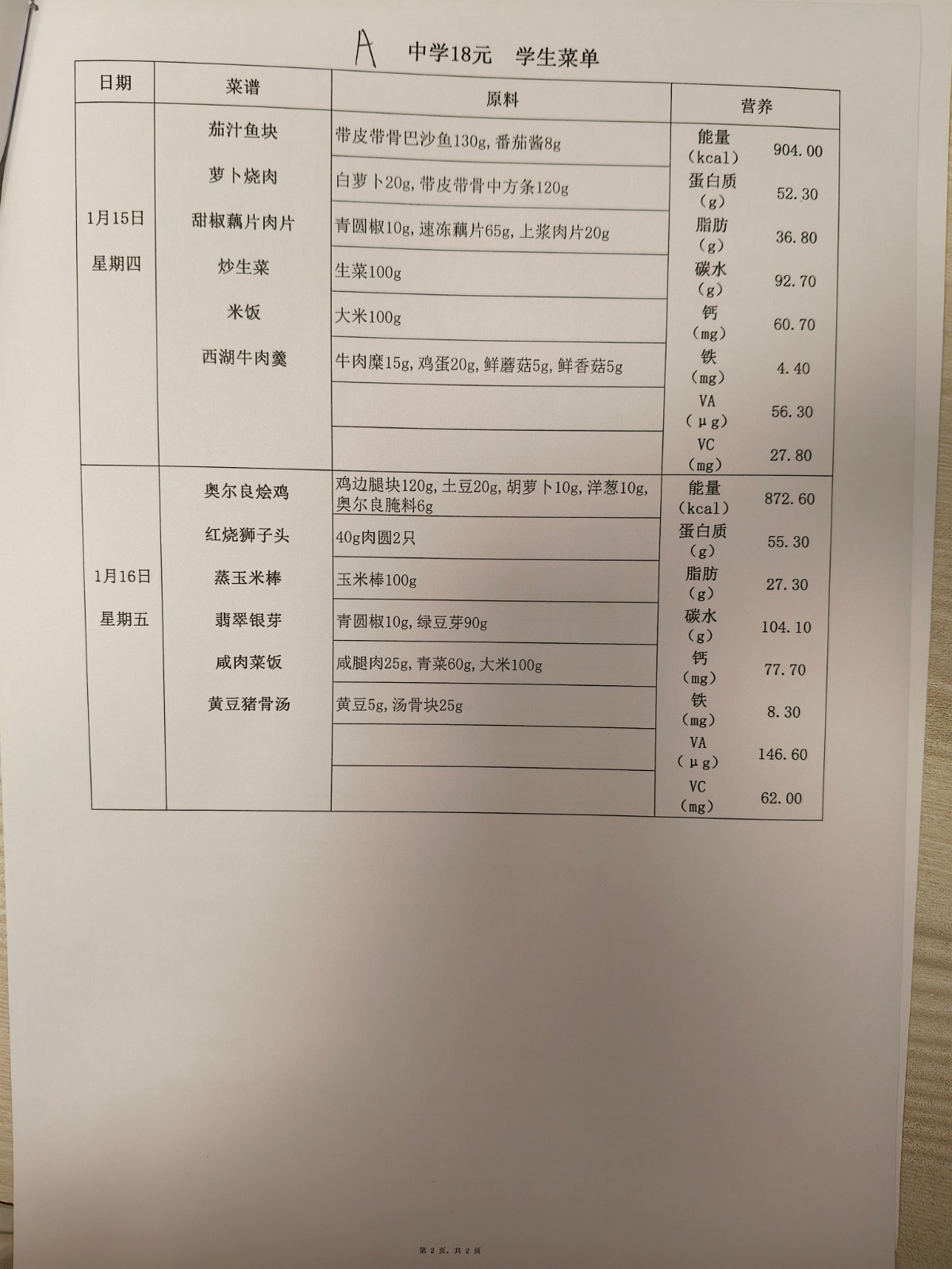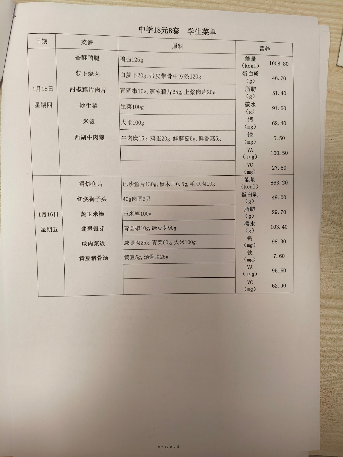 2025学年第一学期第十五、十六周菜单