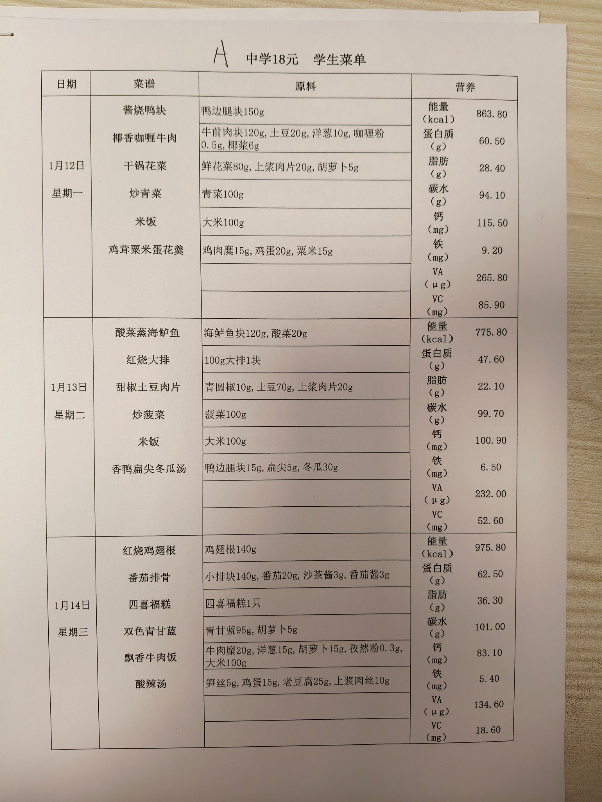 2025学年第一学期第八周菜单