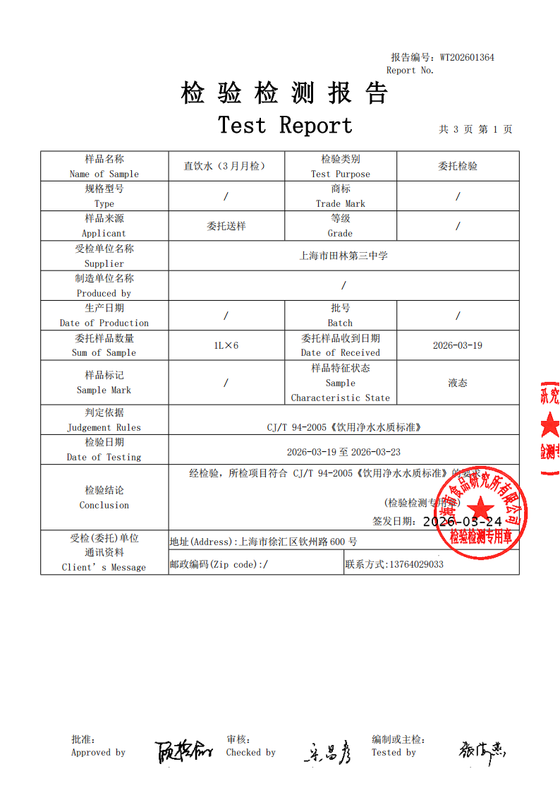 2025学年田林三中直饮水检测报告3月检