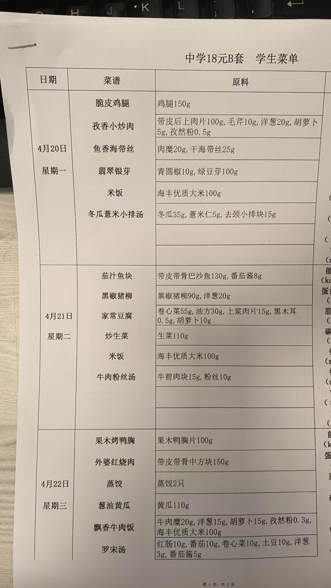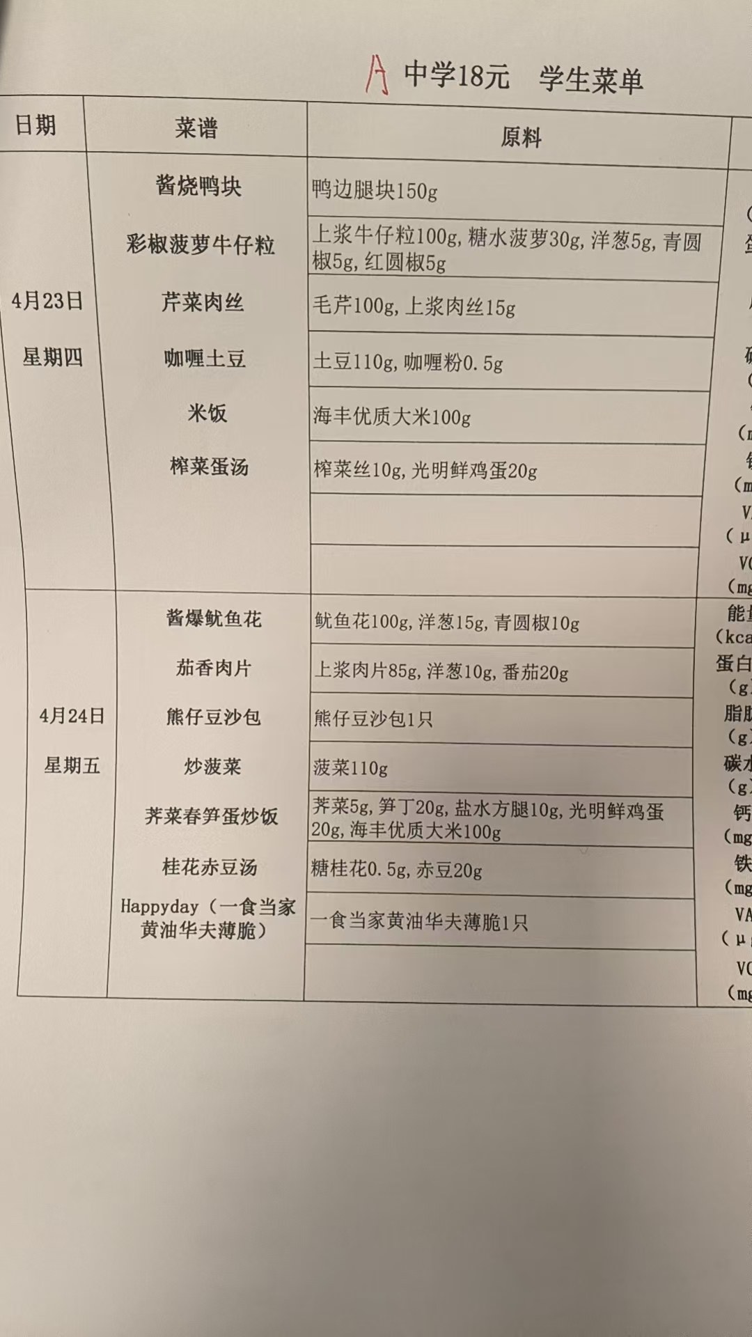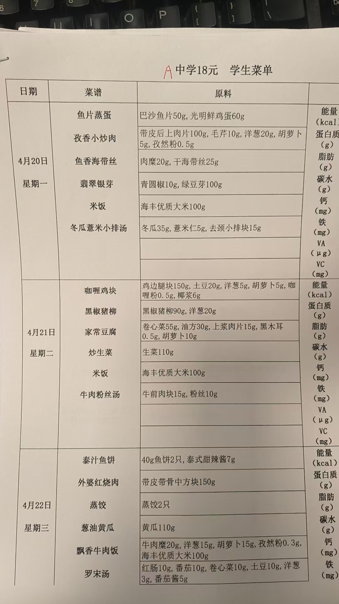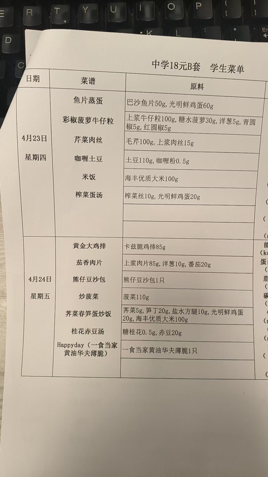 2025学年第二学期第六周带量菜谱